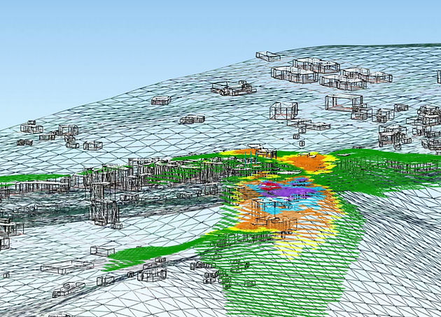 Simulazioni di campo elettromagnetico sul territorio utilizzando i dati deli impianti di telefonia già presenti. Le simulazioni vengono sviluppate con metodo orografico attraverso l'uso di DTM (Digital Terrain Model) o TIN (Triangulated Irregular Network)